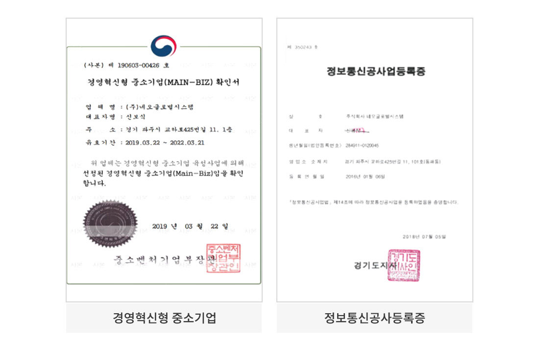 (주)네오글로벌 시스템은 각종 인증서과 수상을 받아